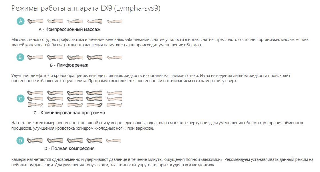 - B. Лимфодренаж: камеры последовательно накачиваются воздухом, не сдуваясь;